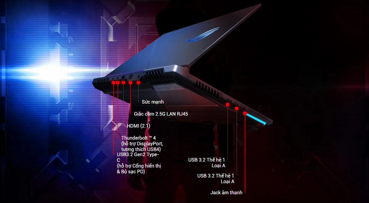 Asus ROG Strix SCAR 15 hoạt động đa nhiệm hiệu quả hơn qua cổng USB-C với DisplayPort 1.4, xem phim 4K UHD trên màn hình lớn hoặc dễ dàng kết nối máy chiếu với HDMI 2.1. Kết nối các thiết bị ngoại vi để bạn thoải mái sáng tạo.