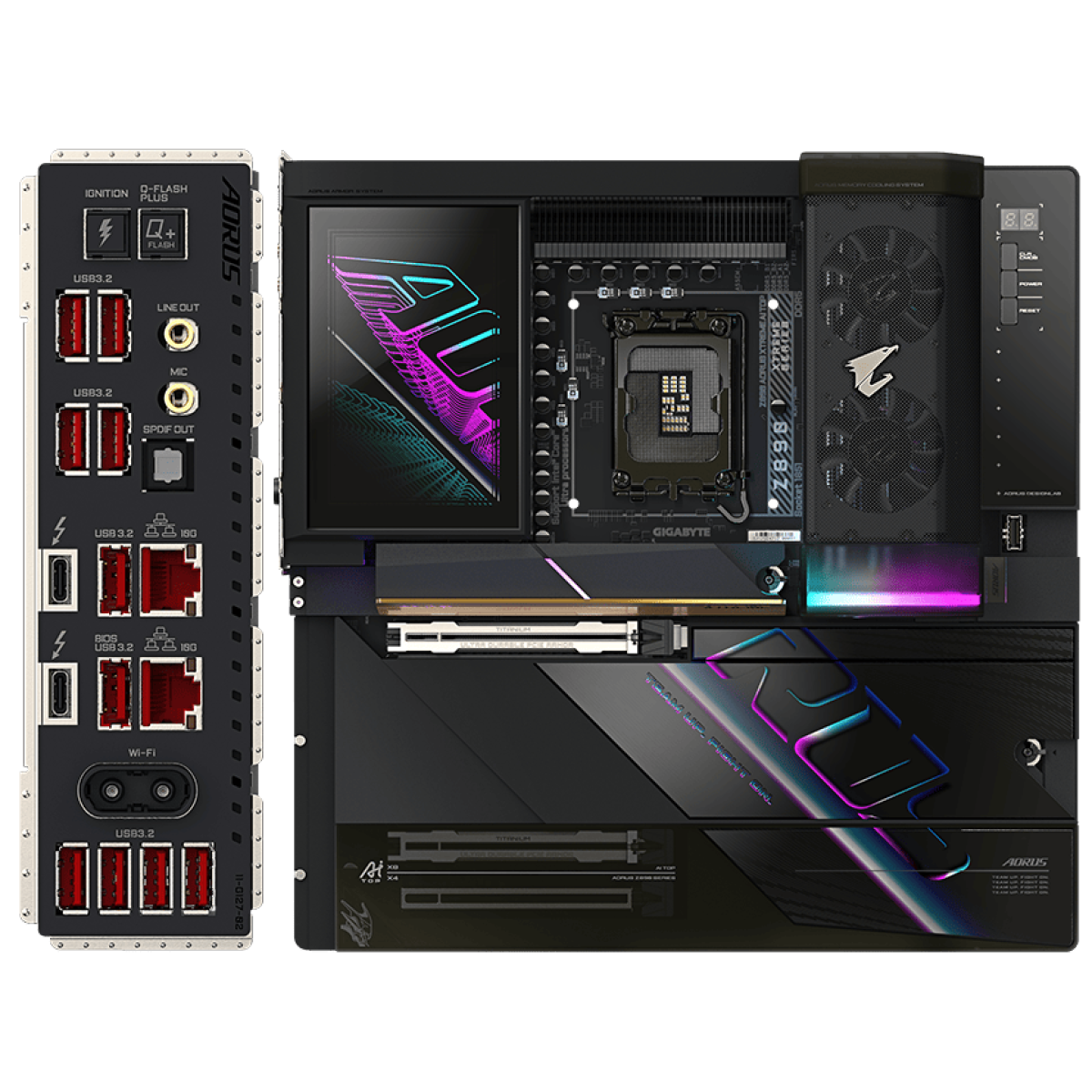 - Tản nhiệt toàn diện được gia cố : VRM Thermal Armor tiên tiến với I/O ZONE AORUS LIGHTING & M.2 Thermal Guard XL