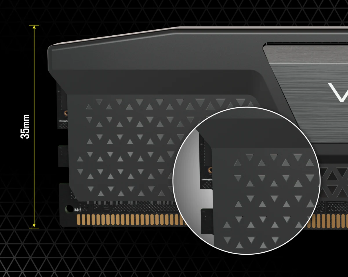 Ram PC Corsair Vengeance DDR5 được trang bị bộ tản nhiệt nhôm giúp cải thiện độ dẫn nhiệt để làm mát tốt nhất ngay cả khi ép xung. |
